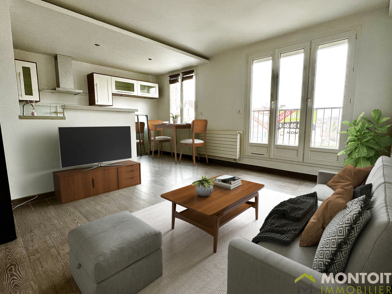 Bel appartement 2 pièces de 47m² offrant une entrée avec placard, un agréable espace de vie, confortable et lumineux avec sa cuisine américaine.