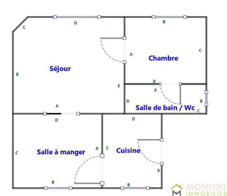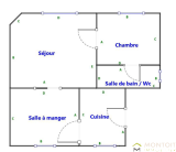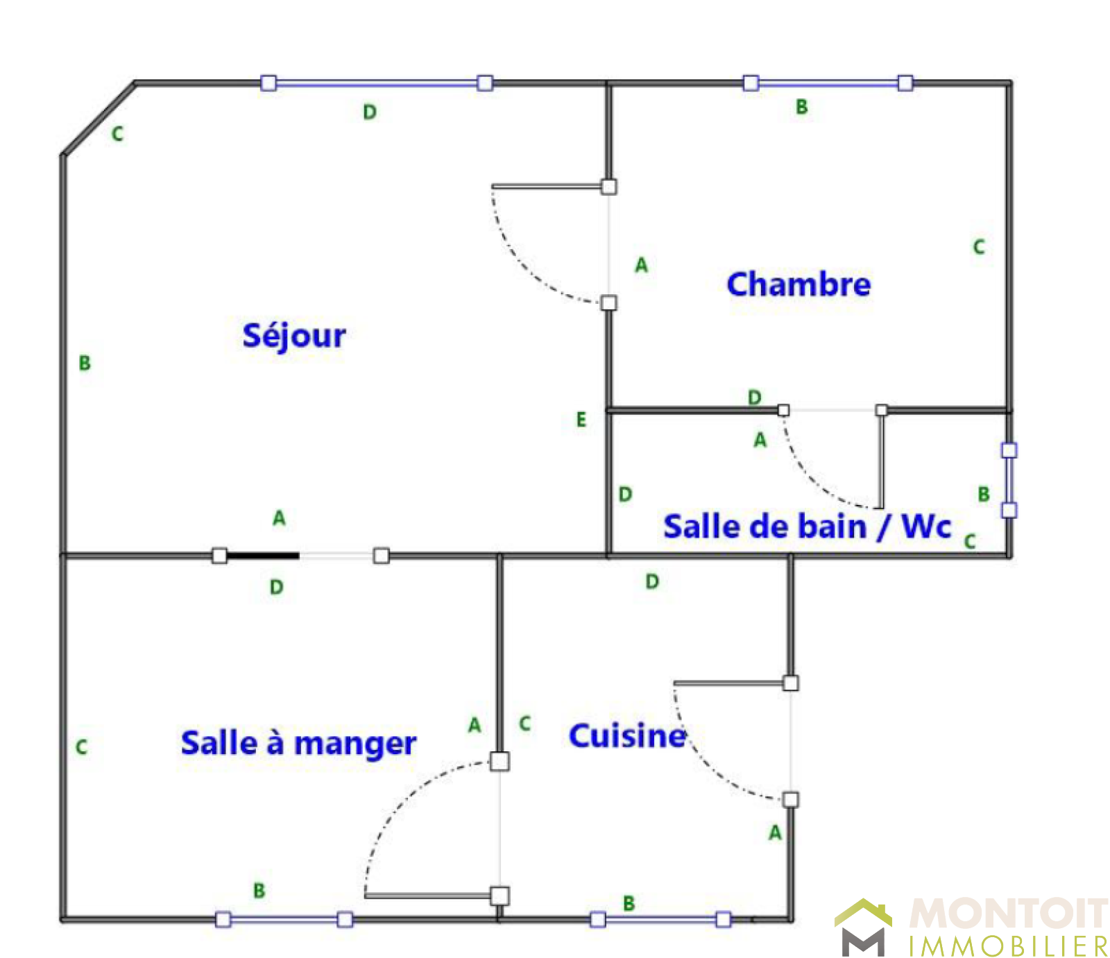 L’appartement se compose d’une entrée, d’une cuisine, d’une salle à manger, d’un séjour, d’une chambre et d’une salle de bains avec WC.