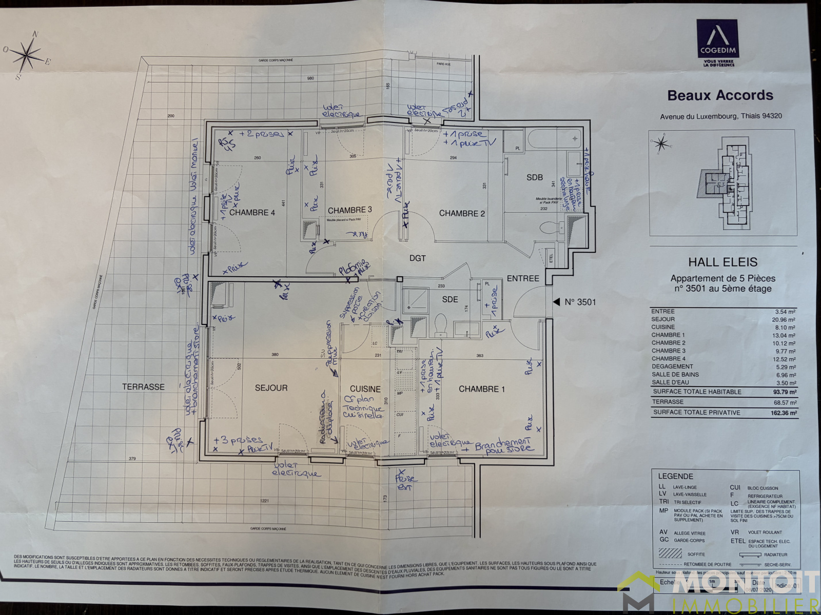 THIAIS, Dans une résidence standing de 2023, proche des transports (ligne 14, tram 7), découvrez ce superbe appartement offrant 94 m² habitables, aux préstations modernes et aux volumes généreux. Dès l'entrée, un dégagement dessert un séjour lumineux ouvert sur une cuisine contemporaine aménagée et équipée, créant un espace de vie convivial et prolongé vers un extérieur offrant une remarquable terrase d'environ 68 m². L'espace nuit se compose de 4 chambres, parfait pour une famille ou pour aménager un bureau / chambre d'ami selon vos besoins. L'appartement dispose également d'une salle de bains avec wc, une salle d'eau avec wc, garantissant confort et fonctionnalité au quotiiden. Présence indispensable d'un double stationnement, une place en sous-sol sécurisé et une place aux normes PMR.
