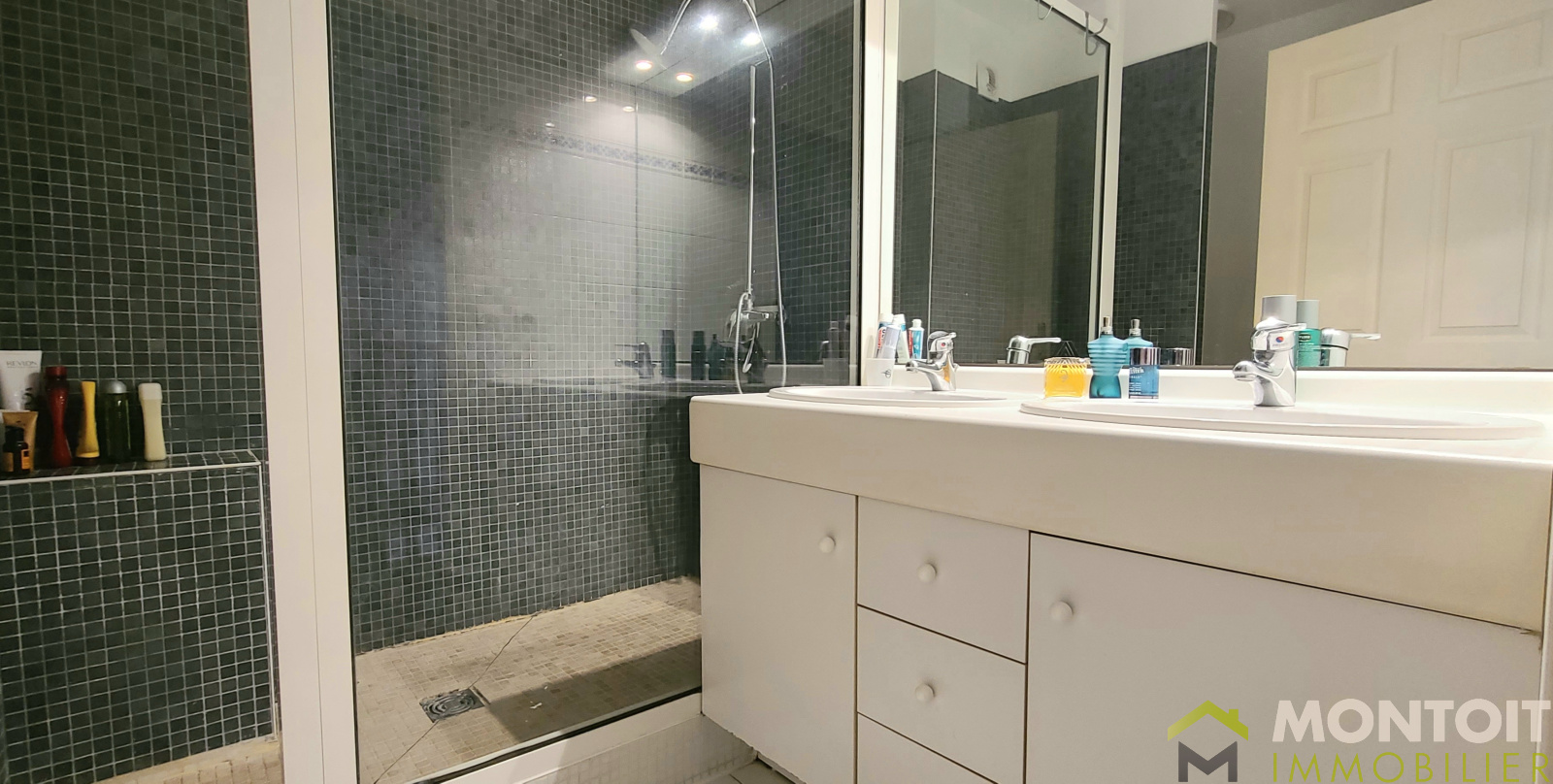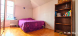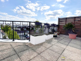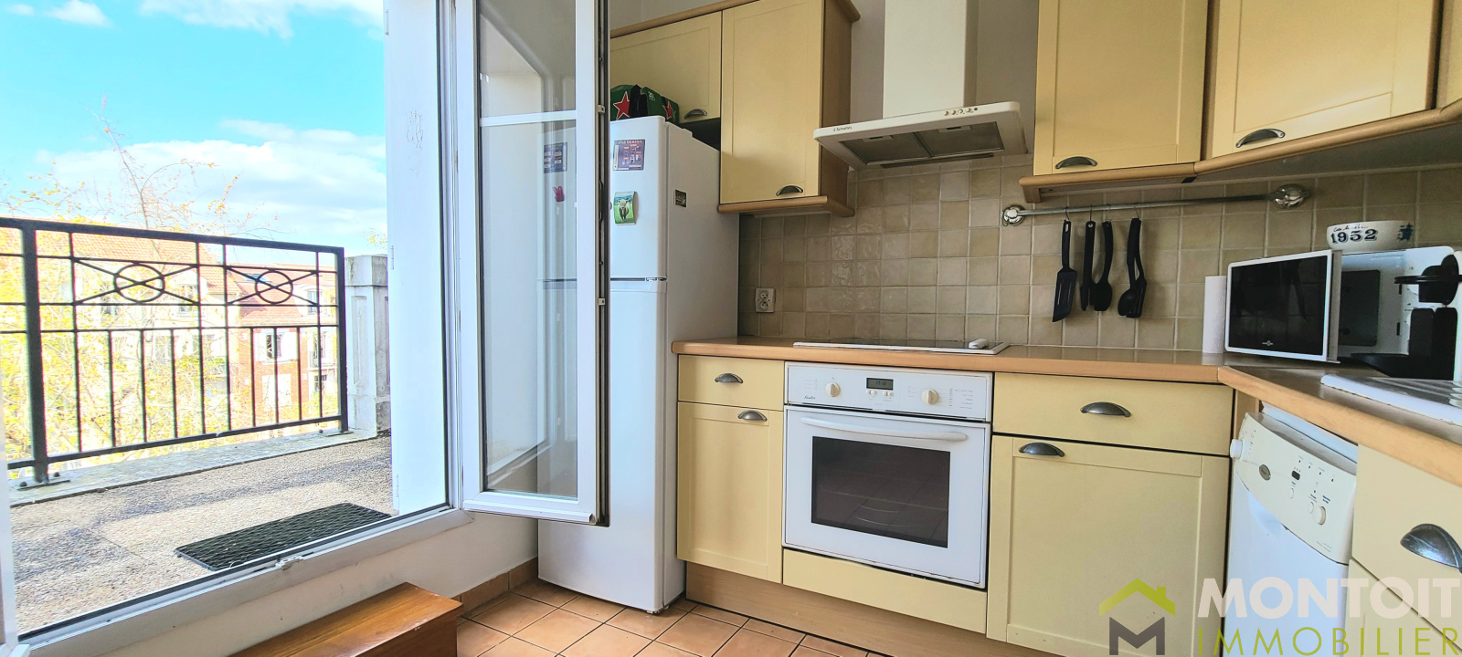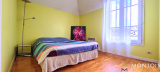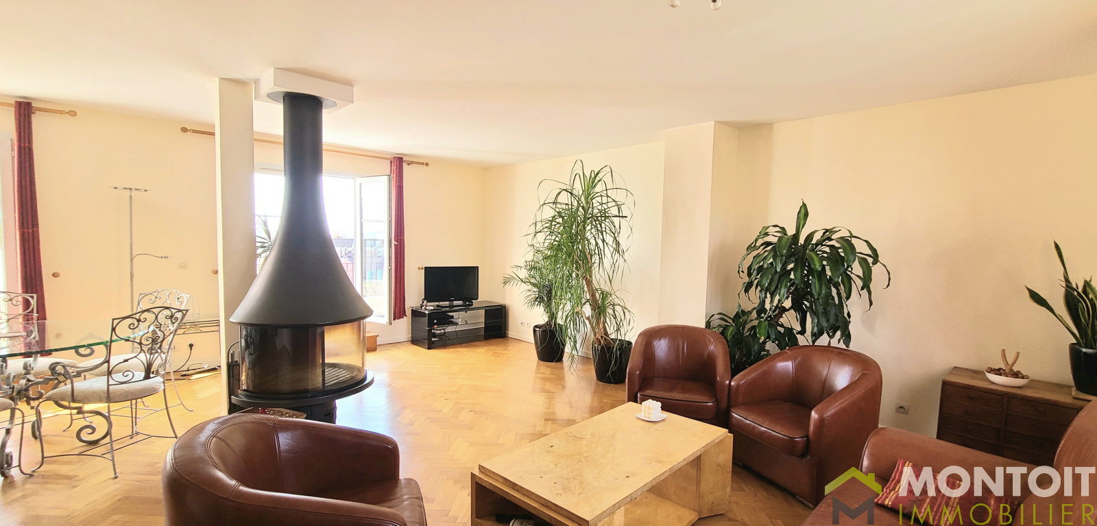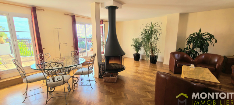 Une entrée avec placard, un double séjour de 40m² avec cheminée et son accès à la terrasse exposée Sud de 27m², une cuisine aménagée avec accès au balcon (13 m²) et sa vue sur les toits, un wc indépendant.