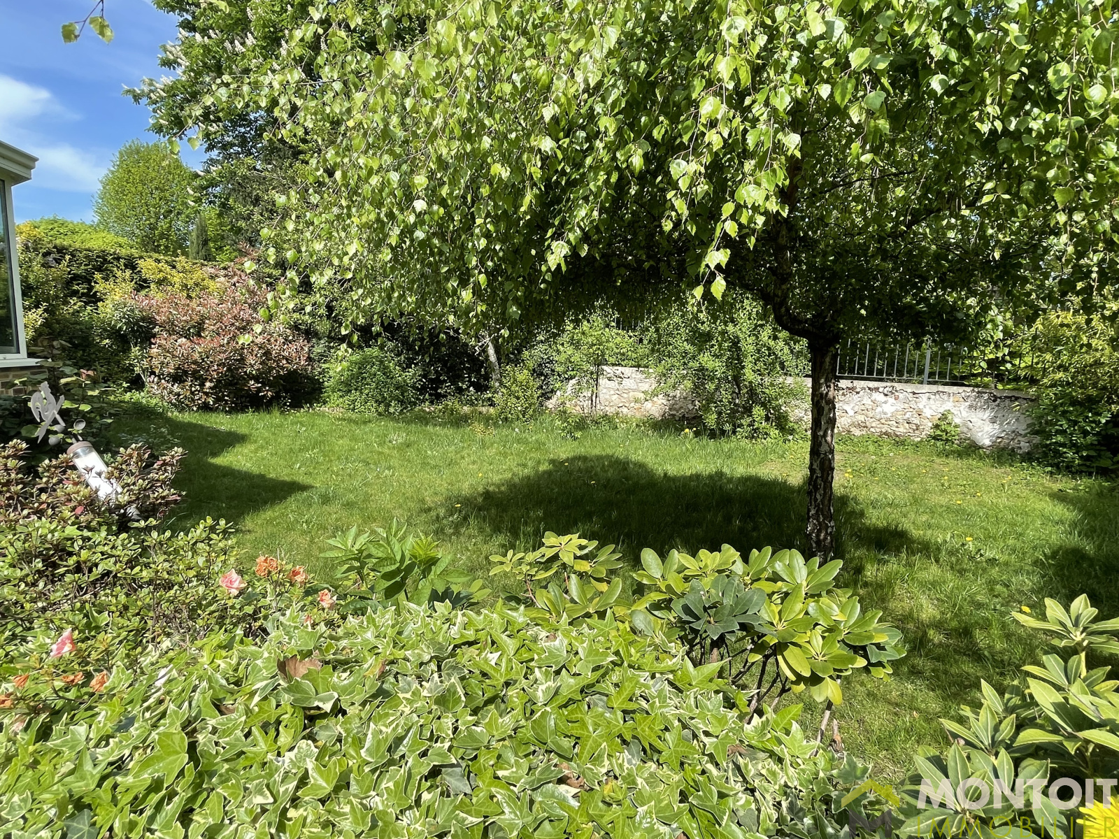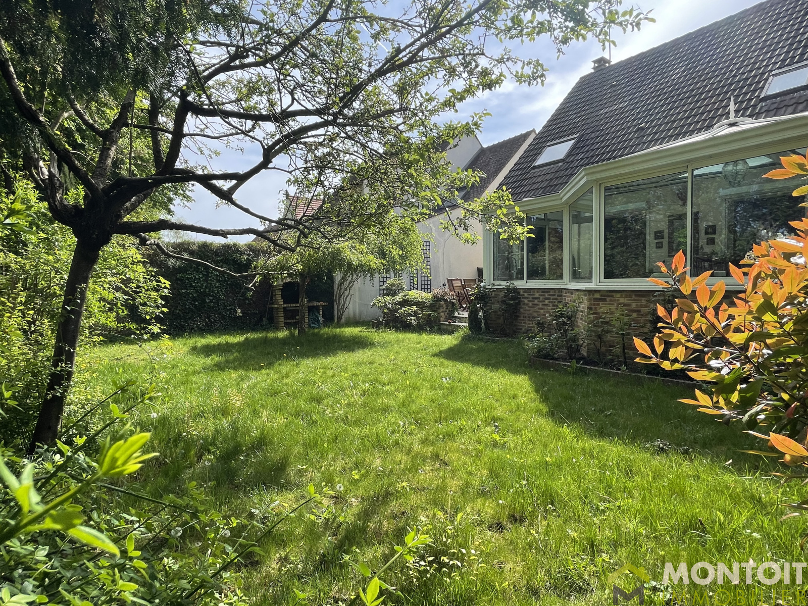 Un agréable jardin et une terrasse à l'avant, une autre terrasse à l'arrière avec barbecue en pierre, le tout sans vis-à-vis et un cabanon sur le côté de la maison.