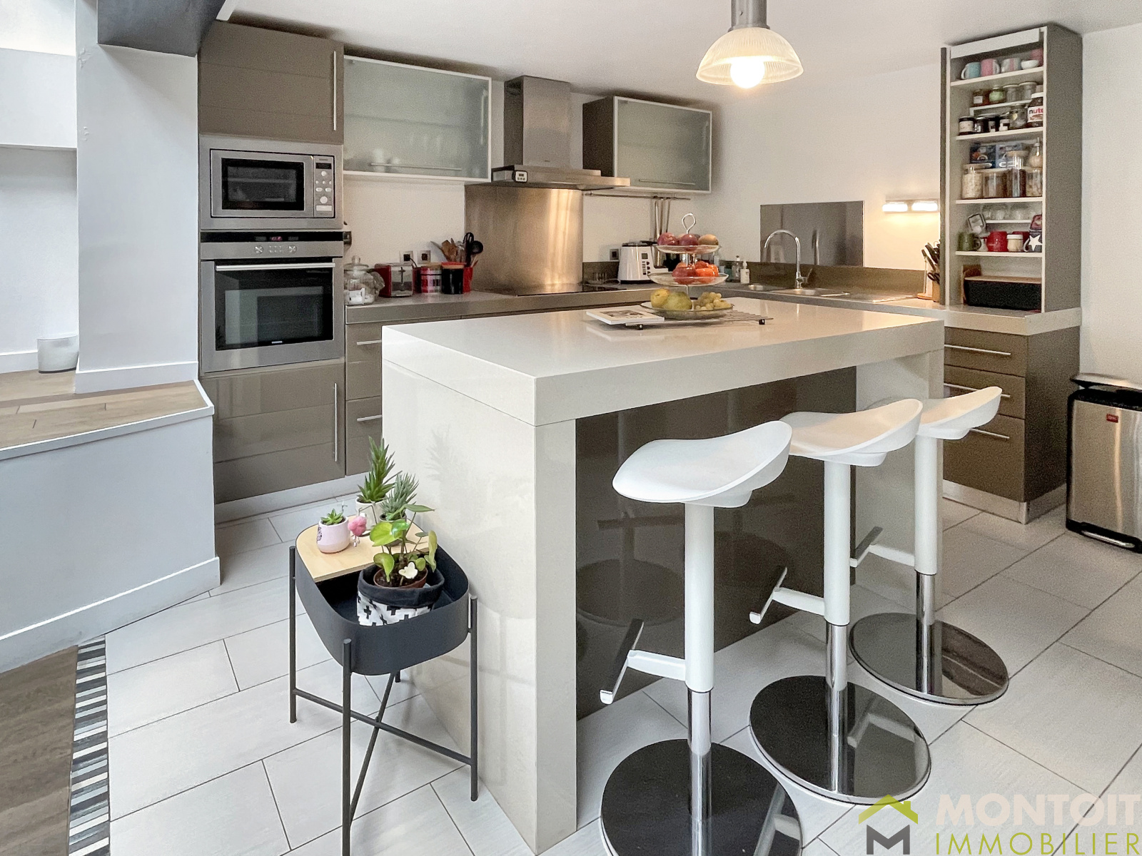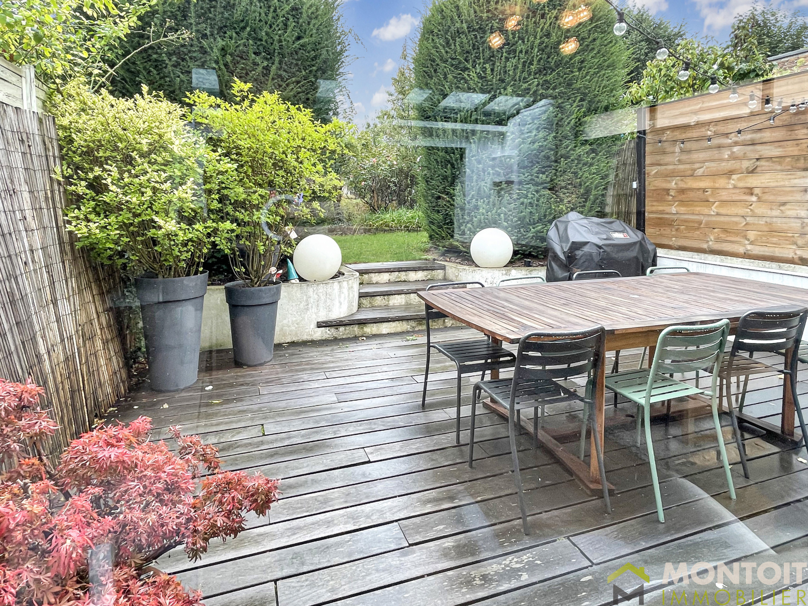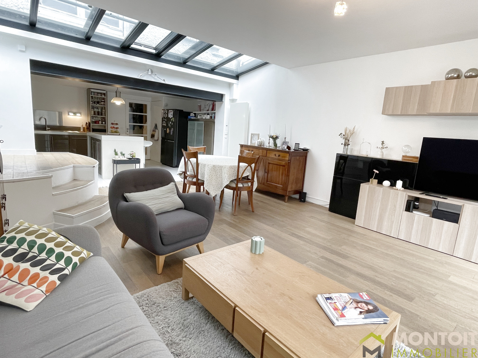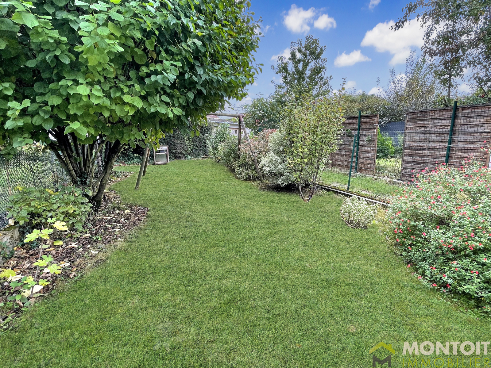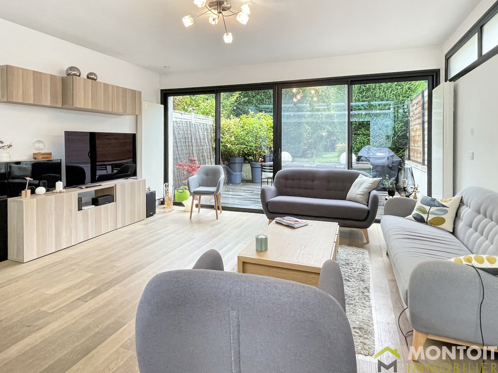 Très agréable espace de vie de près de 50m² avec sa cuisine ouverte aménagée et équipée, salon avec sa baie vitrée donnant directement accès à la terrasse cosy et à son jardin exposés Sud.