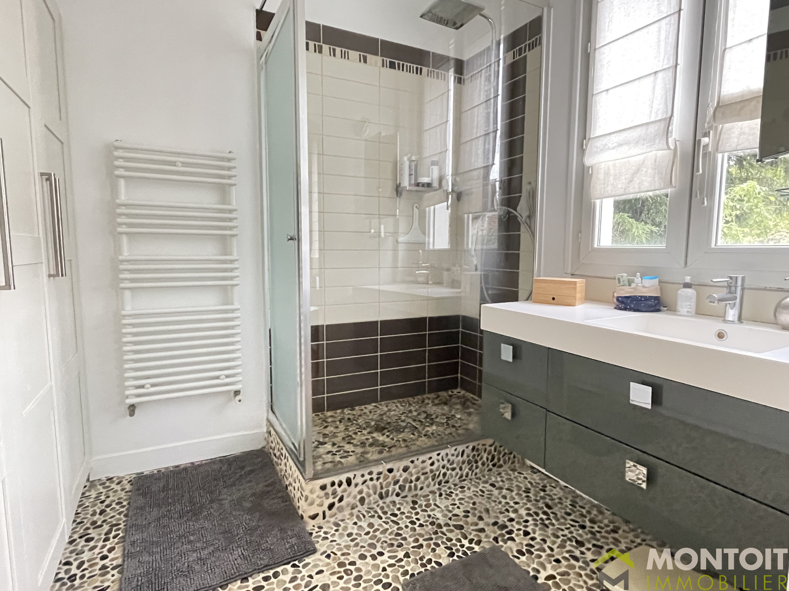 A l'étage, 2 belles chambres avec chacune un grand placard de rangements, une salle de bains + douche et un wc indépendant également.