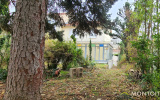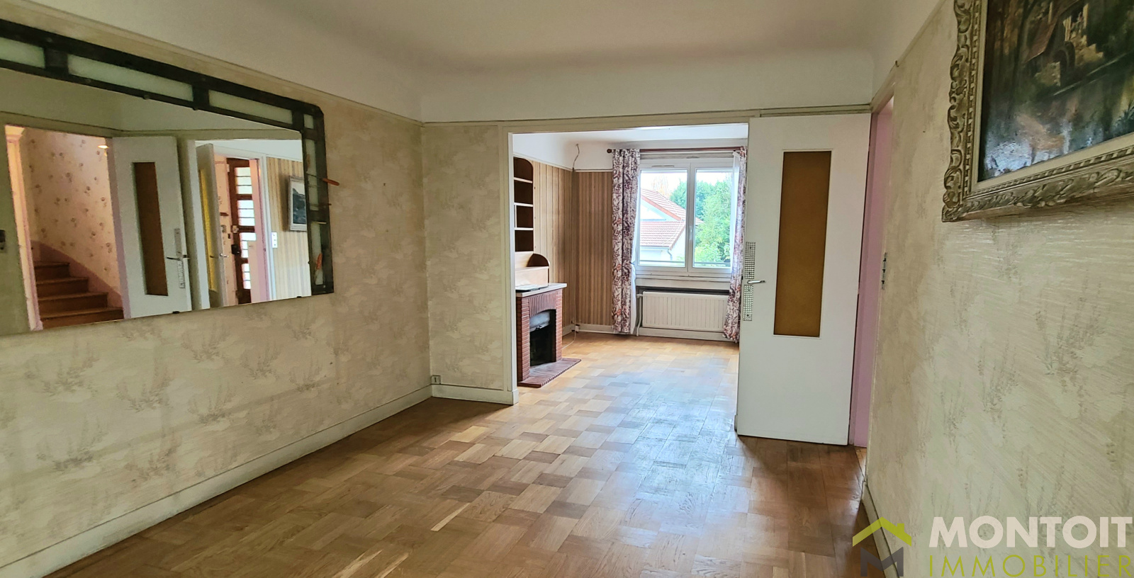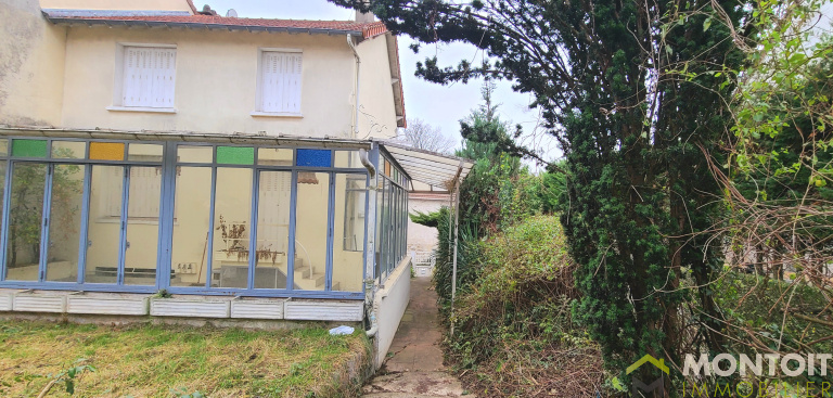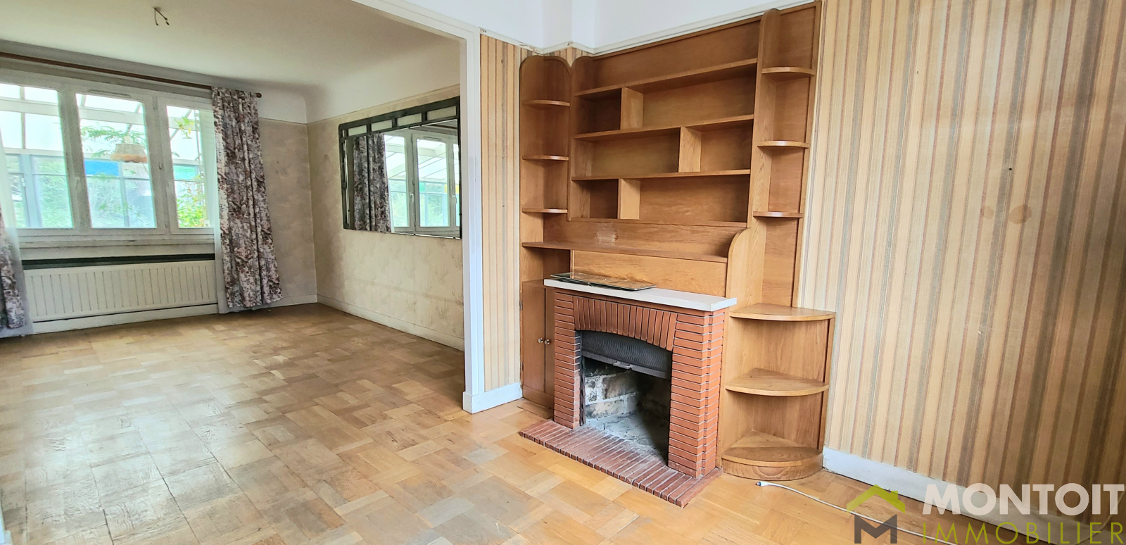 Dessus est édifiée une maison de 133m² environ + sous-sol avec garage, avec double séjour, cuisine, véranda, 3 grandes chambres, SDB et 2 wc. Le tout est à rénover mais offre déjà du double-vitrage , vrai parquet massif , isolation extérieure et très belles hauteurs sous plafond..