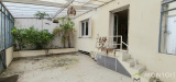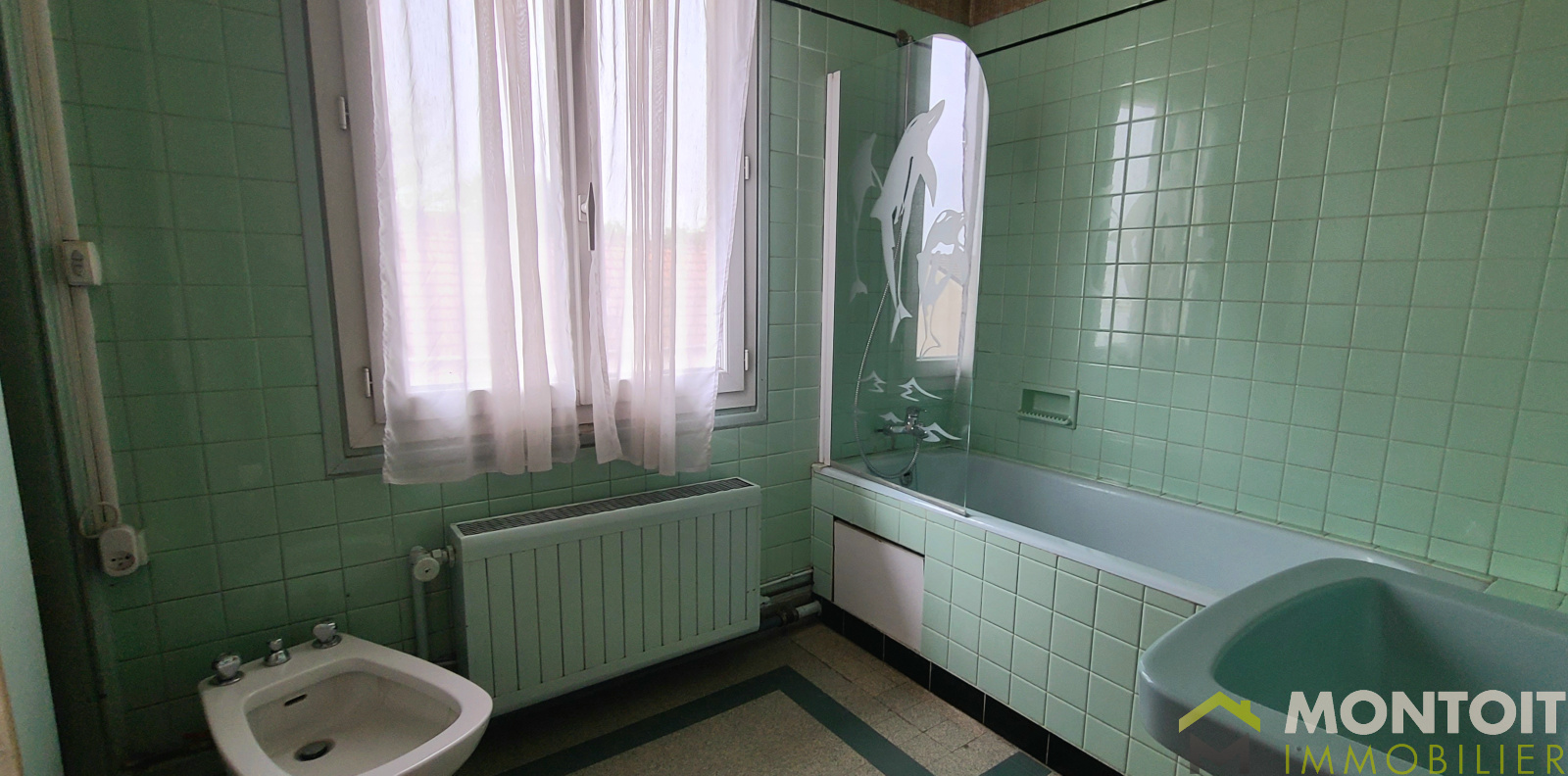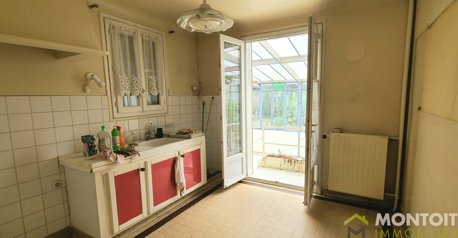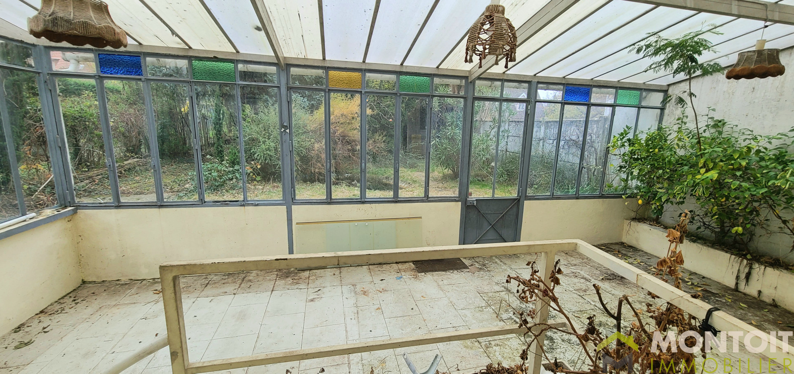 Dessus est édifiée une maison de 133m² environ + sous-sol avec garage, avec double séjour, cuisine, véranda, 3 grandes chambres, SDB et 2 wc. Le tout est à rénover mais offre déjà du double-vitrage , vrai parquet massif , isolation extérieure et très belles hauteurs sous plafond..