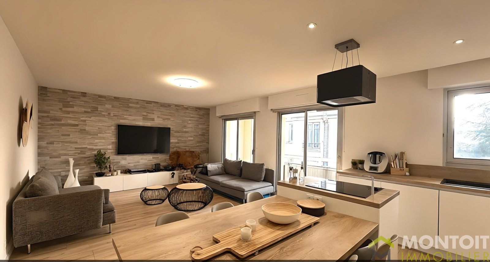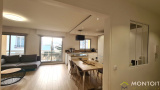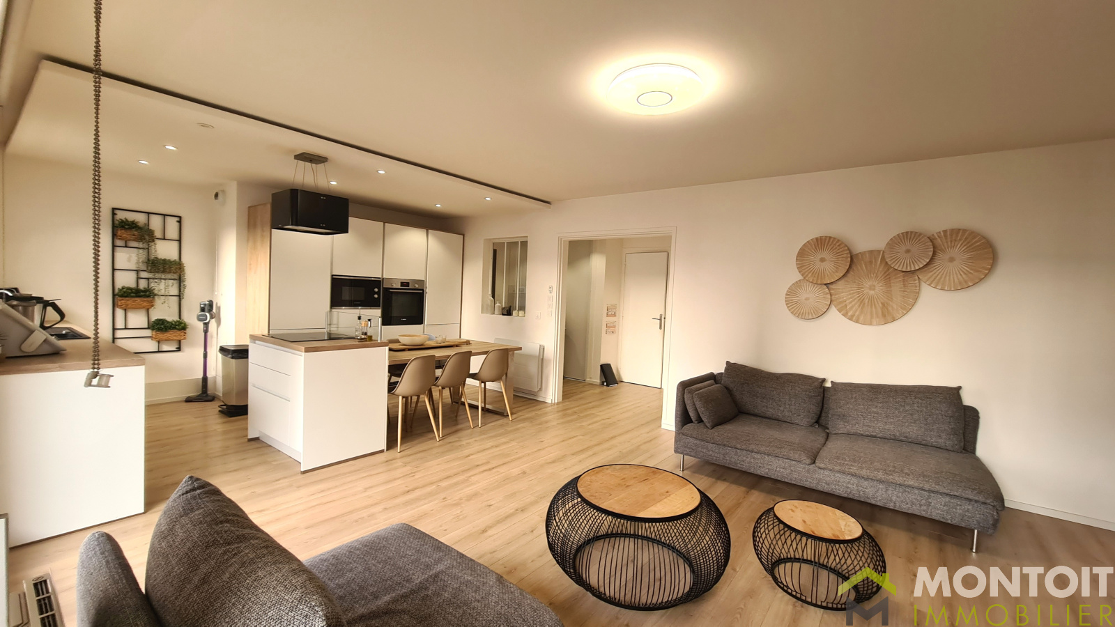 Une entrée avec rangement, W.C, un spacieux et lumineux séjour avec cuisine ouverte, et balcon.